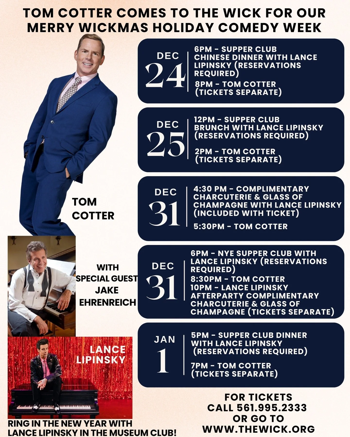 Each performance includes special complimentary touches, from a welcoming champagne reception to unforgettable performances and heartfelt moments honoring Sarge. Hosted by Jake Ehrenreich and headlined by the incomparable Tom Cotter, the week is also filled with live holiday music from Lance Lipinsky at the piano throughout the run — culminating in a New Year’s Eve celebration to ring in 2026 in true Wick style.