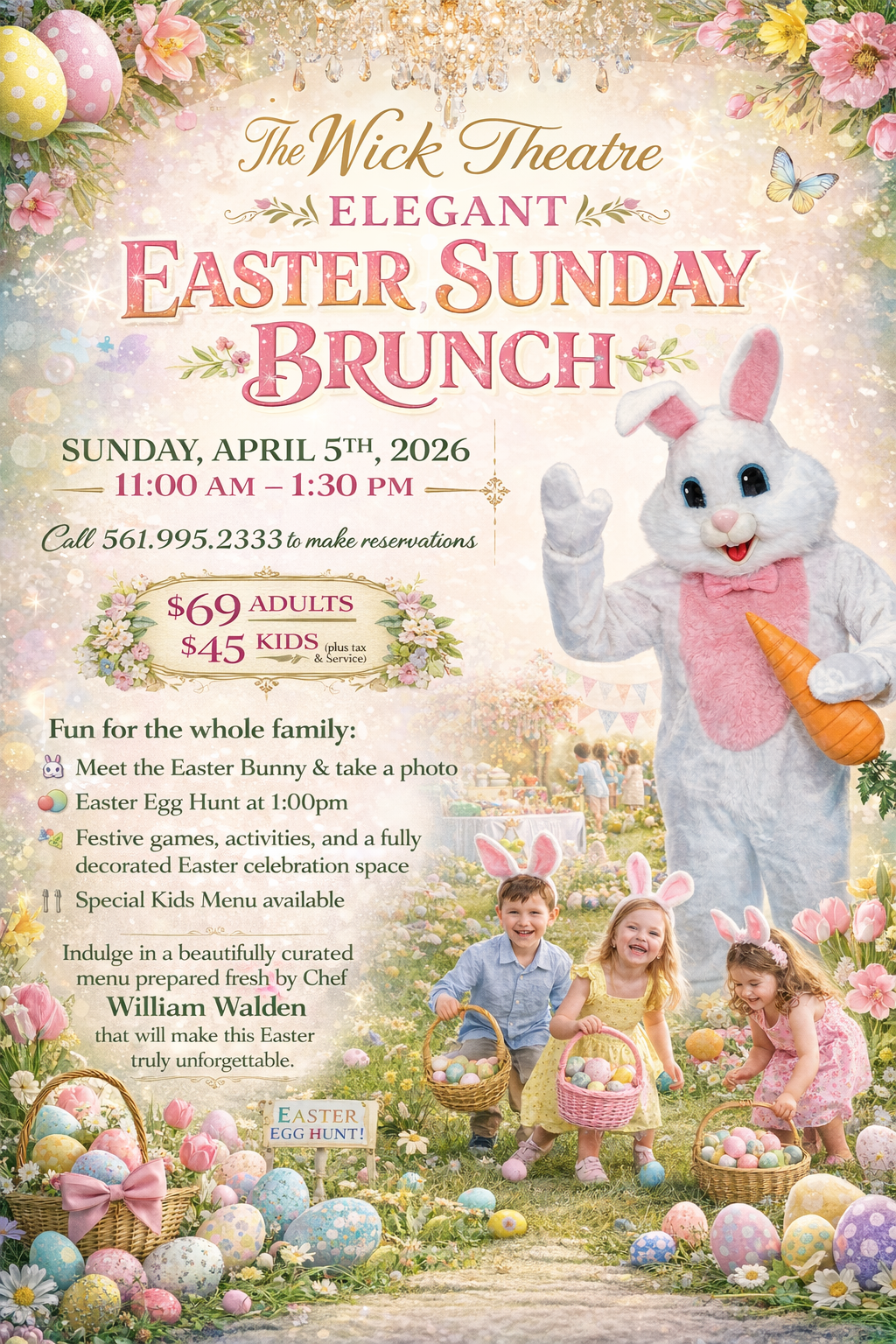 Join us for a truly elegant Easter Champagne Sunday Brunch made fresh by Chef William Walden on April 5th from 11:00am–1:30pm—where exquisite cuisine meets the magic of live theatre. Easter Egg Hunt at 1pm, photos with the Easter Bunny and fun for the entire family!